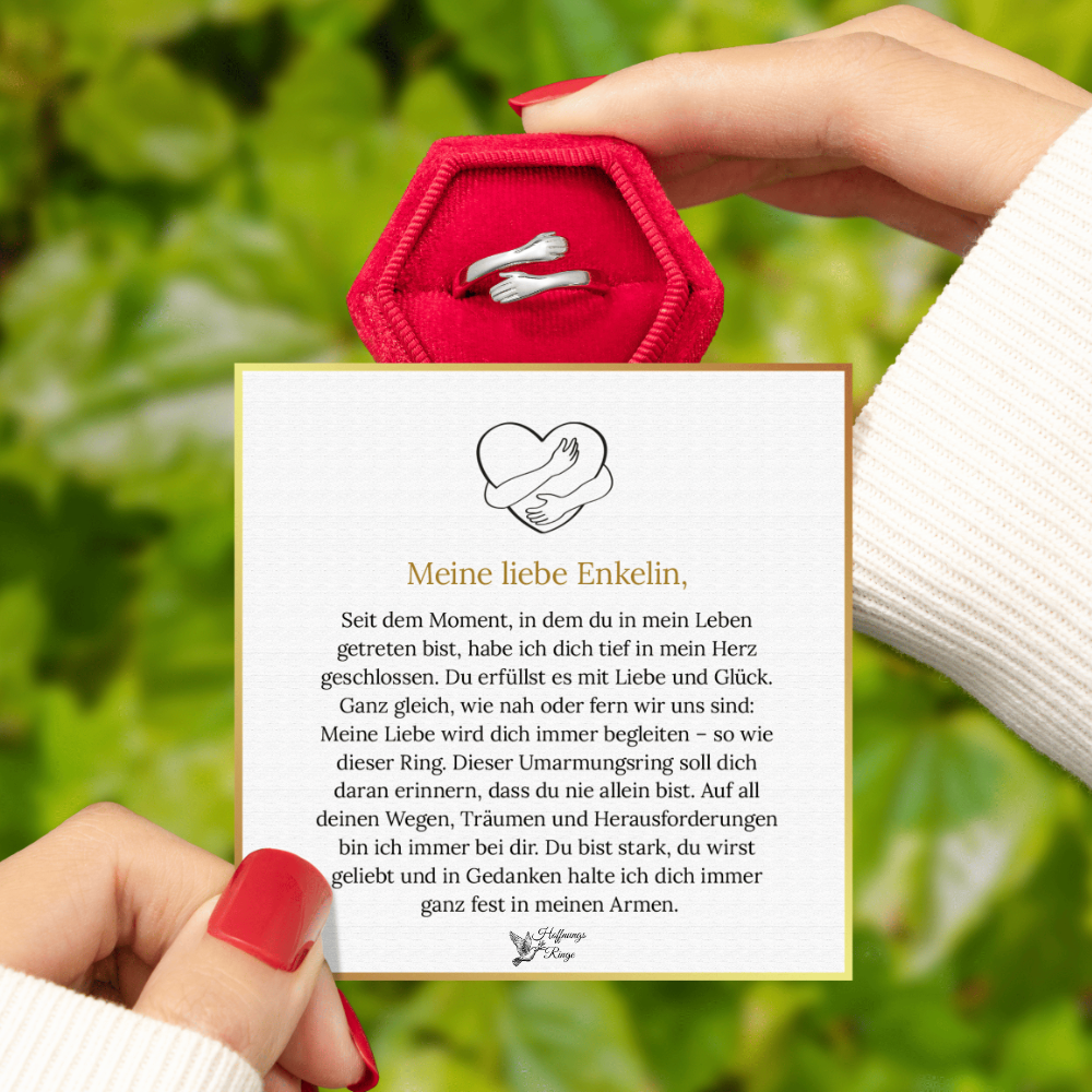 Unser Umarmungsring für die Enkelin steht für eine Liebe, die ein Leben lang hält – und darüber hinaus. Als Symbol der unzertrennlichen Verbindung zwischen Großmutter und Enkeltochter erinnert er Tag für Tag daran, wie eng ihr verbunden seid.