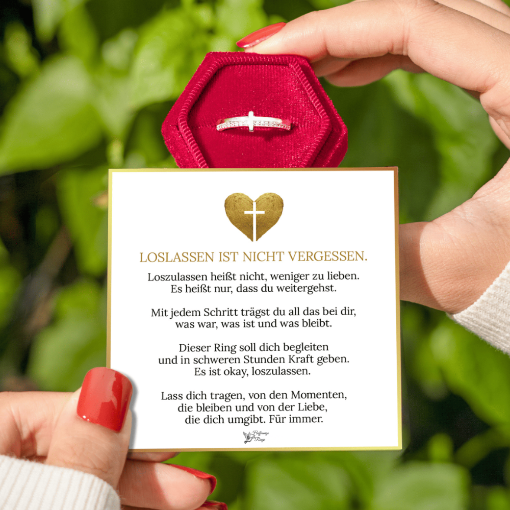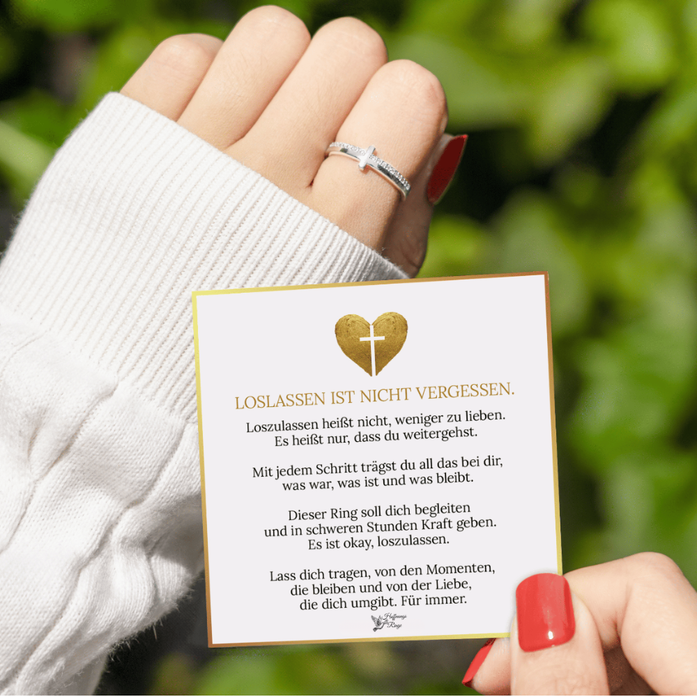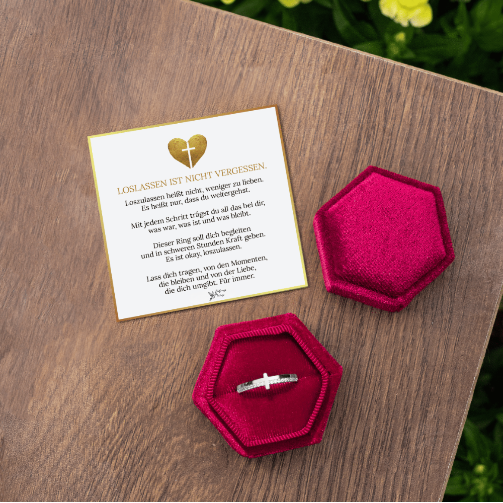 Unser Ring „Lass los“ begleitet dich in Momenten des Abschieds. Das feine Kreuz in der Mitte steht für Vertrauen, Hoffnung und den Mut, loszulassen. Ganz ohne Schuld, ohne Angst und ohne zu vergessen.