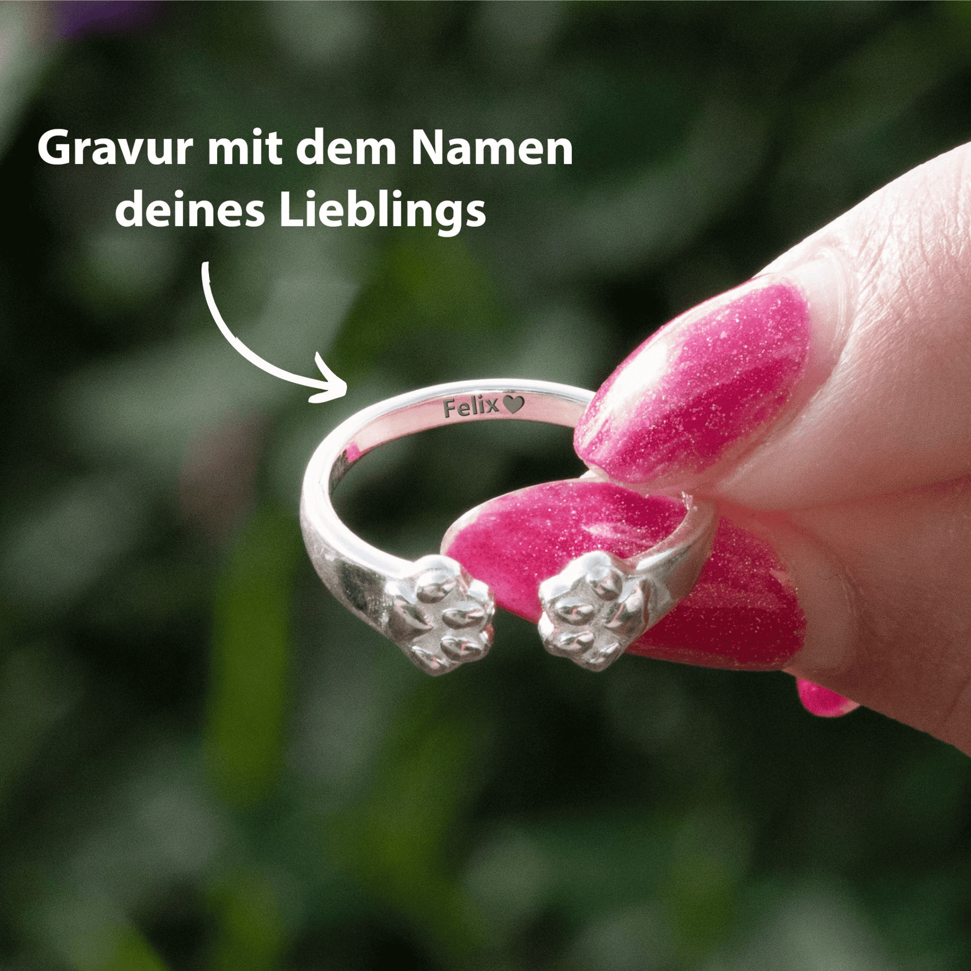 Der Ring Pfotenliebe erinnert an schöne gemeinsame Momente und bedingungslose Zuneigung. Er ist ein Symbol für die Wärme und Nähe, die unsere tierischen Begleiter in unser Leben bringen.